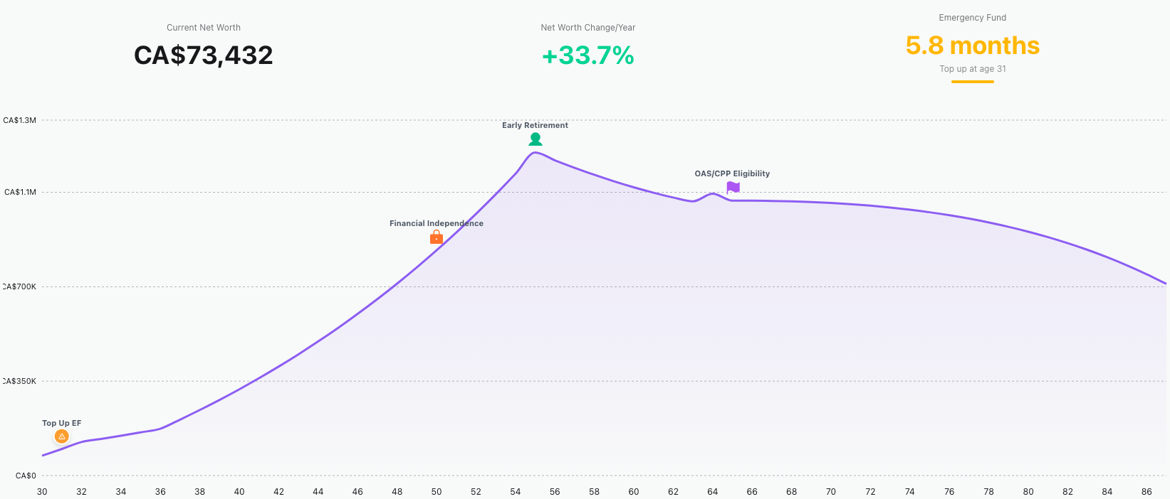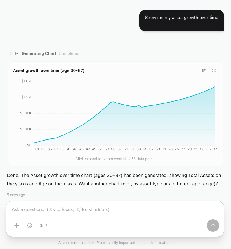 "What if I retire 3 years earlier?" or "Show me my net worth at 65"